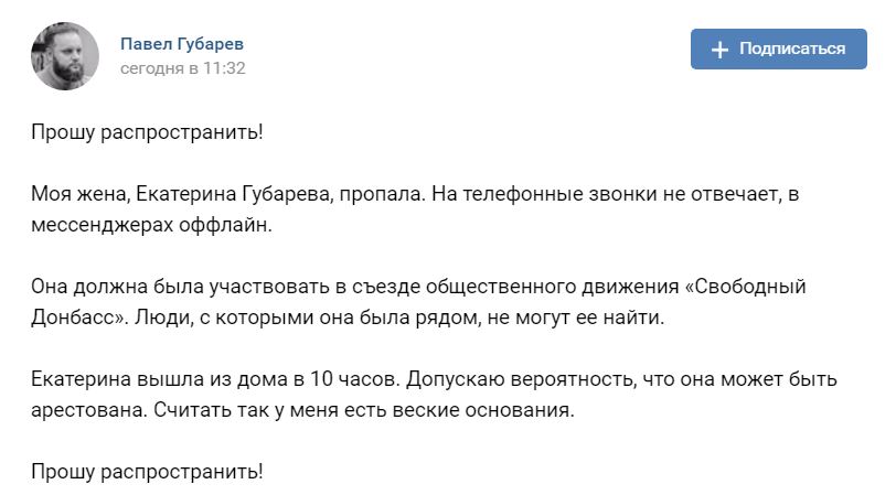 Жену Павла Губарева похитили, она не отвечает на звонки, скорее всего арестована. Партия "Свободный Донбасс", которую возглавляло семейство Губаревых, рейдерски захвачена группировкой людей Пушилина. Сегодня прошел съезд этой организации, на который людей Губаревых не допустили.